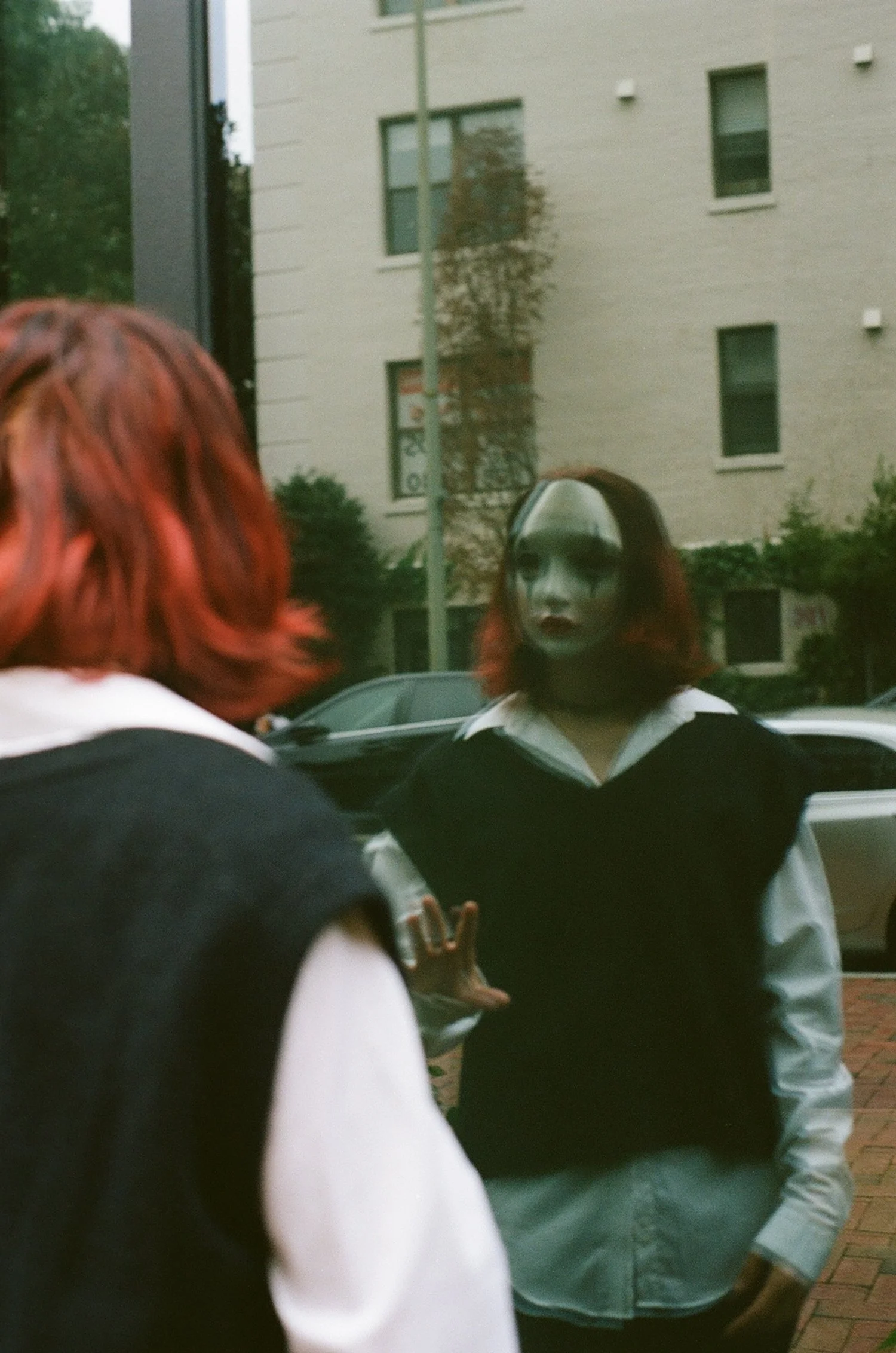What does it mean to perform humanity? Each model represents one archetypal emotion: Happiness/Infatuation, Anger/Destruction, Sadness/Isolation, Fear/Anxiety, and Hope/Longing. The sixth character, Mimic, is the culmination of these emotions and the central figure in an exploration of emotional presentation and social conventions. The ongoing clown motif throughout the series represents a fool-like play that happens when the pressure to conform is turned on its head. The masks limit the ability to be expressive and in combination with the makeup solidify the identity of the characters as only one thing, forever forced into a box. It also alludes to the idea of neurodivergent masking, in which a person “camouflages their natural personality or behavior to conform to social pressures”.